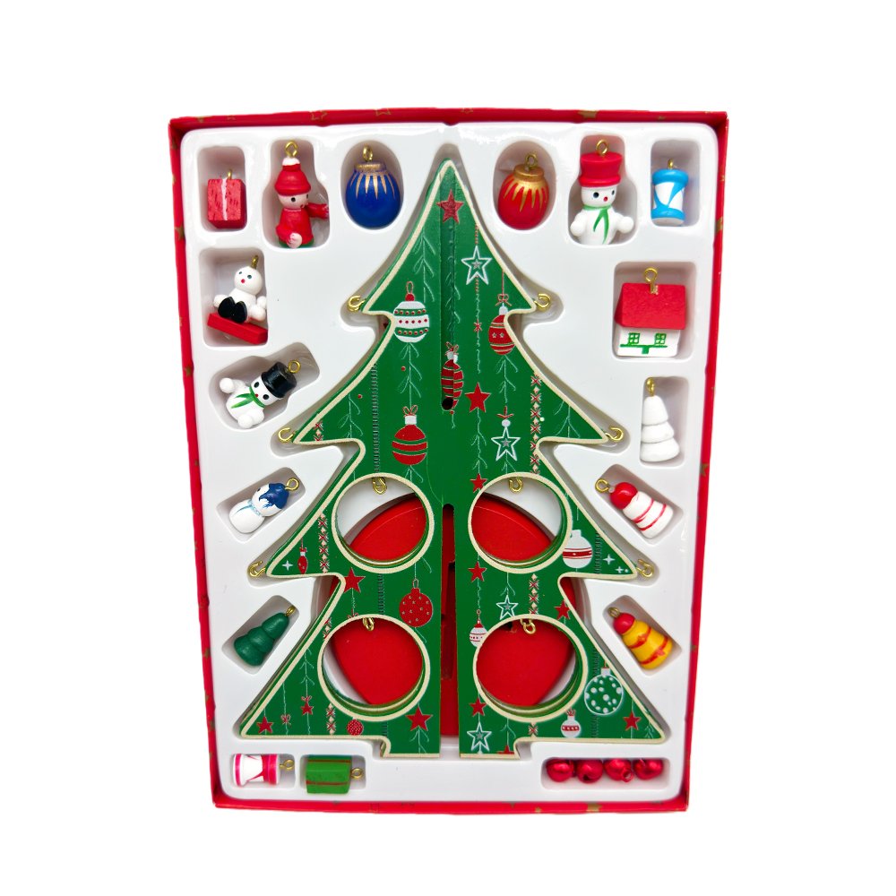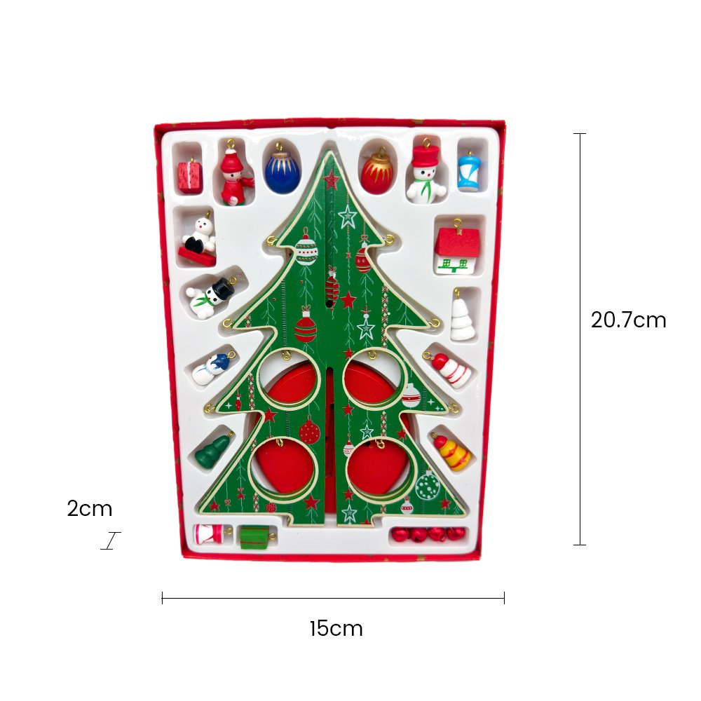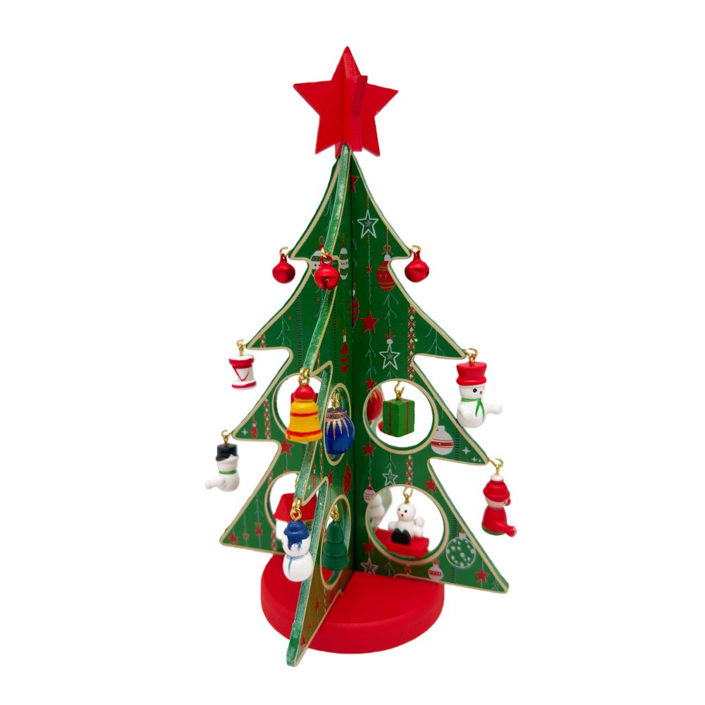 Celebrate Christmas creativity with our DIY Wooden Christmas Tree Decoration Kit! This charming green holiday tree includes hand-painted miniature ornaments such as Santa, snowmen, gift boxes, drums, snowflakes and festive baubles. The printed hanging ornaments and star topper bring instant seasonal cheer to any room.