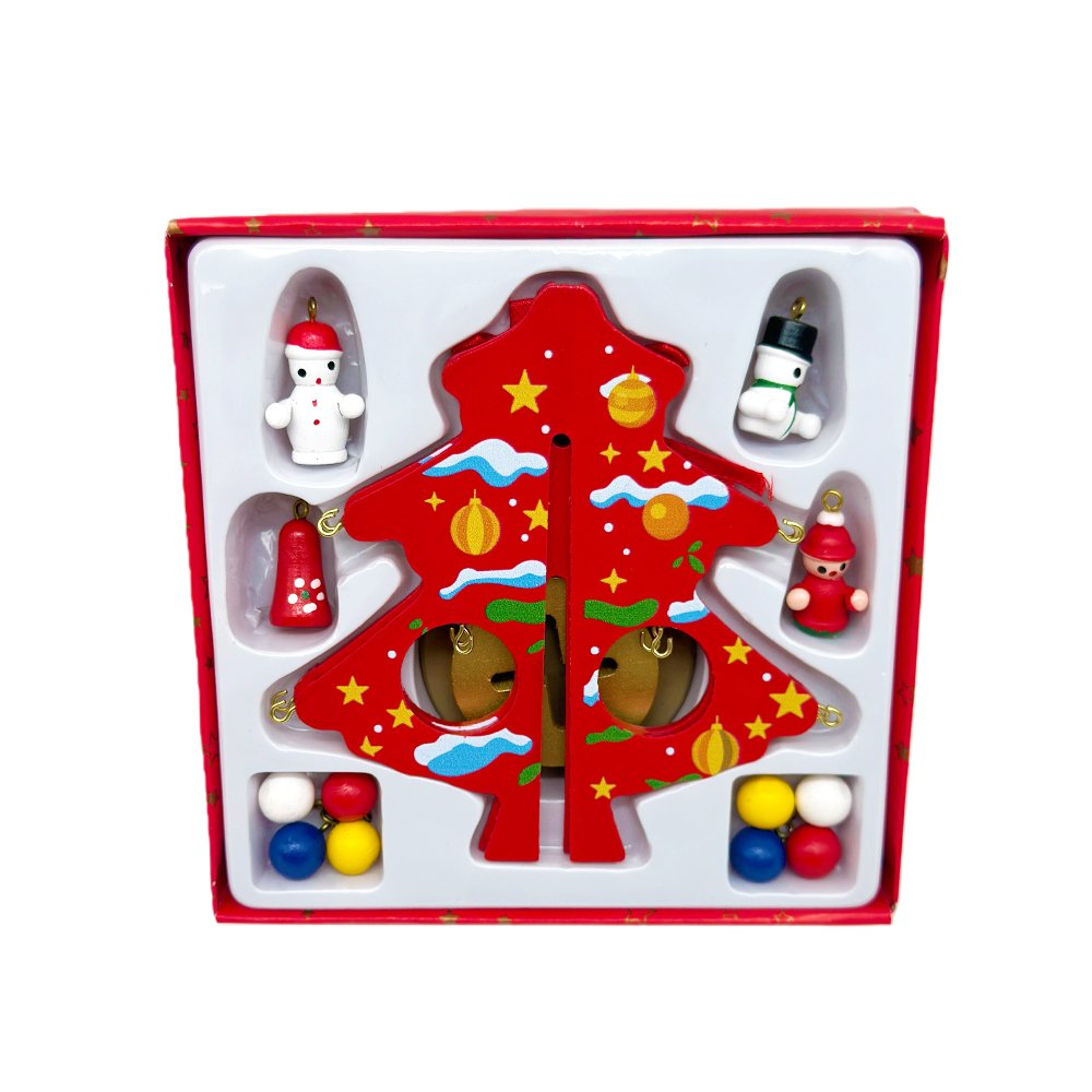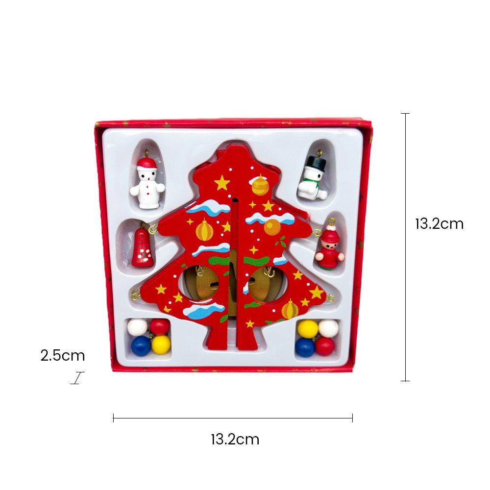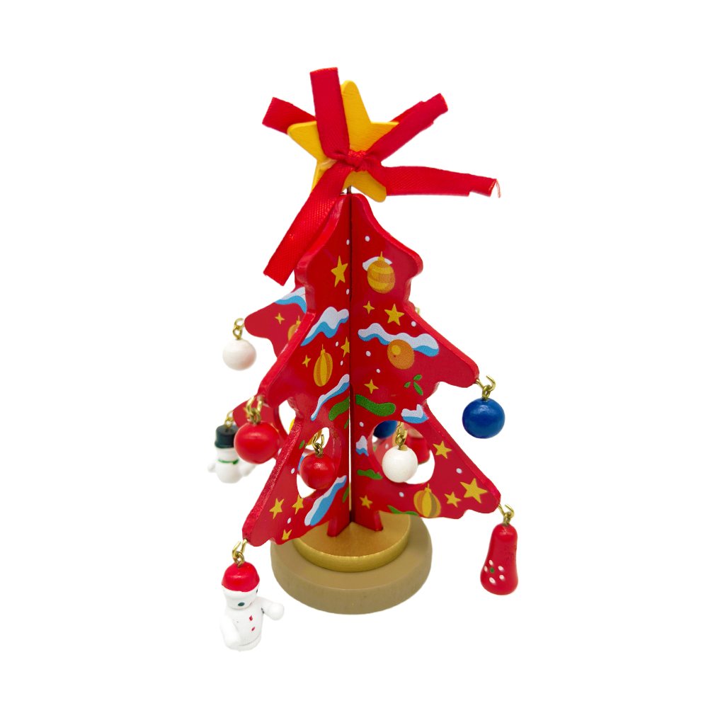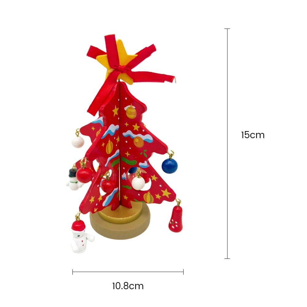 Celebrate the festive season with this adorable DIY Wooden Christmas Tree Craft Kit! This red tabletop Christmas tree features fun holiday artwork including stars, baubles, and snow details. It comes with 10 mini ornaments such as Santa, snowman, bells, and colorful festive balls to hang freely and create your own unique Christmas decoration.