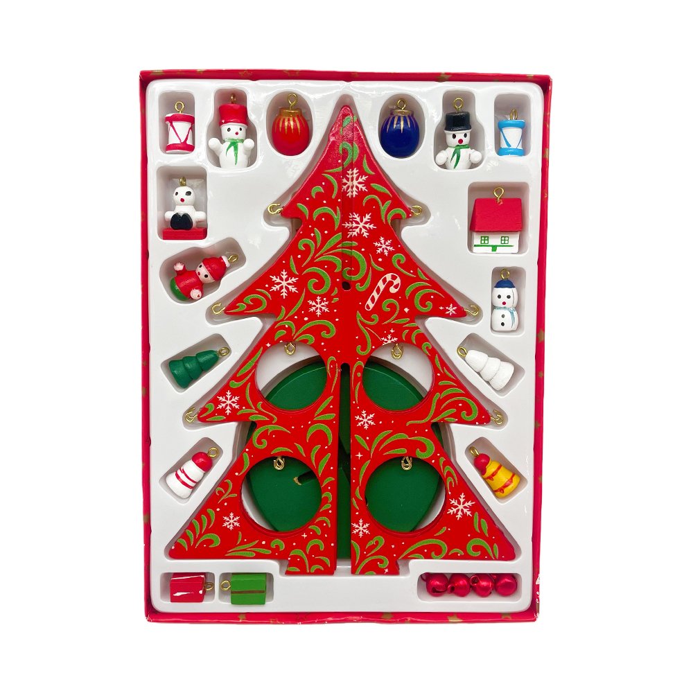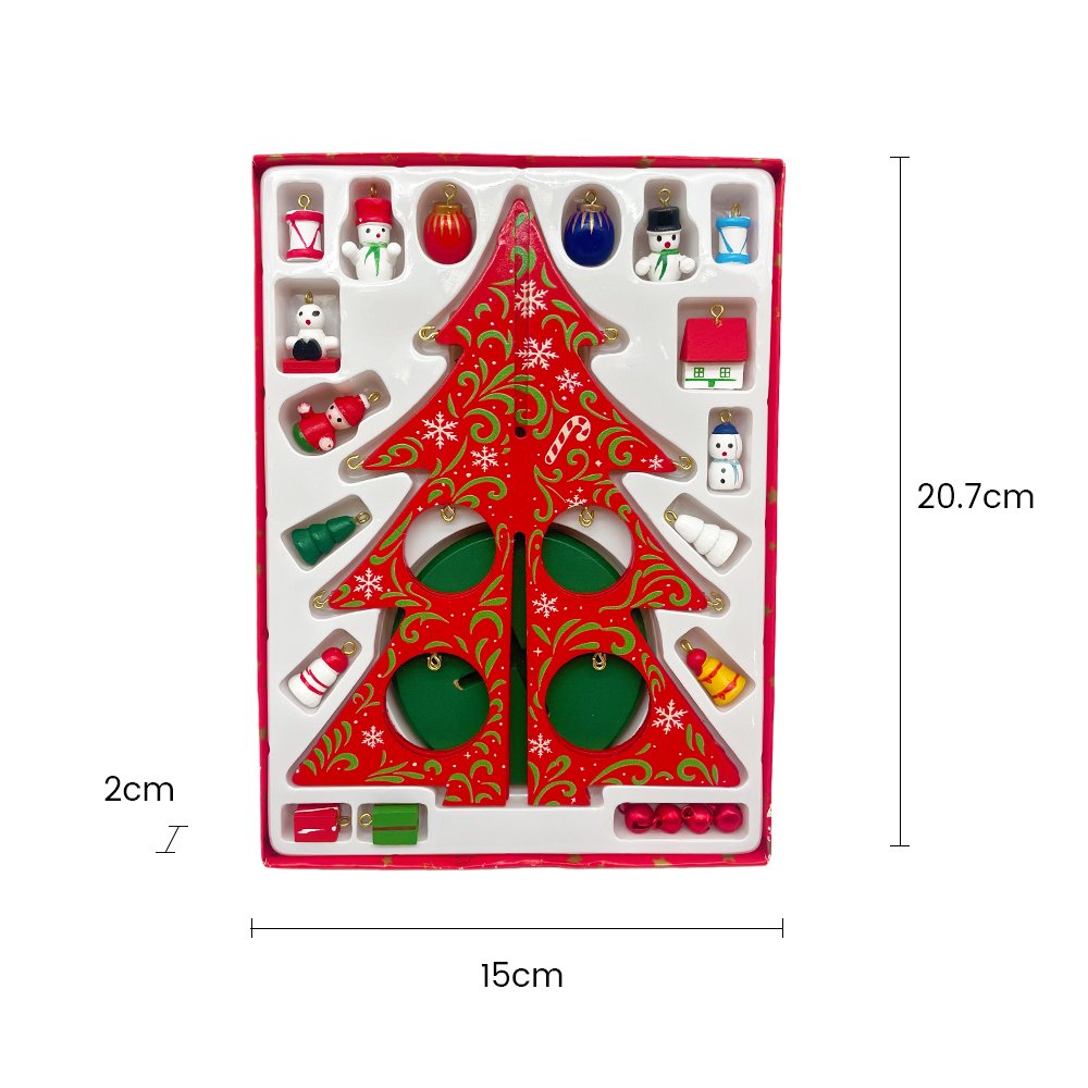 The set includes a standing wooden tree and multiple hand-painted mini ornaments such as Santa, snowmen, bells, gift boxes, and charming holiday figures. Simply assemble the tree and decorate it with tiny hooks — fun, easy, and perfect for kids and families to enjoy together!
