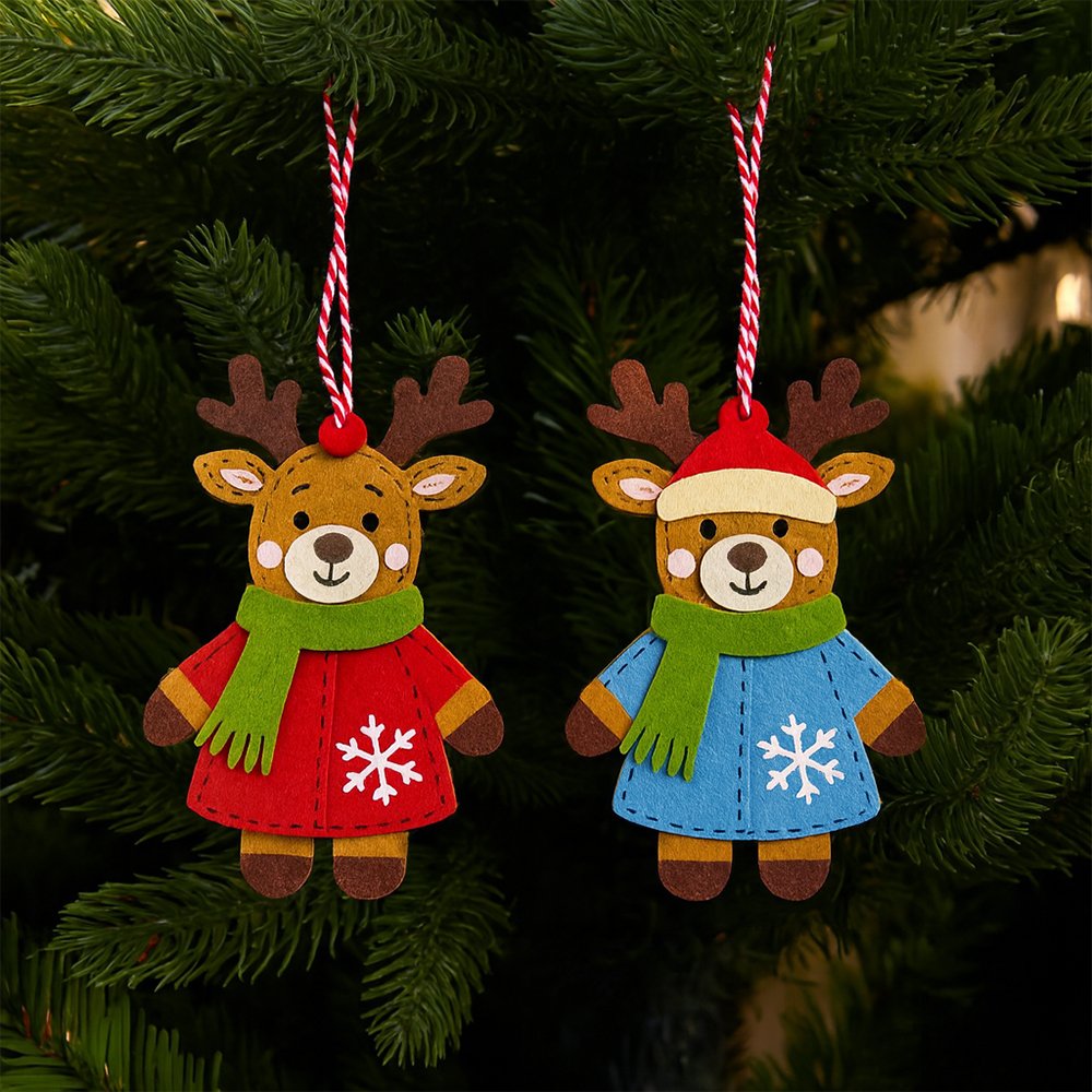 Add a touch of festive charm to your holiday décor with these adorable Felt Reindeer Hanging Ornaments. Each set includes two cute reindeers dressed in colorful winter outfits — one in a red coat with a snowflake design, and the other in a blue coat and Santa hat. Made from high-quality non-woven felt, these ornaments are soft, lightweight, and eco-friendly, perfect for decorating Christmas trees, wreaths, or gift packages. Their cheerful expressions and handcrafted details bring warmth and joy to any Christmas setting.