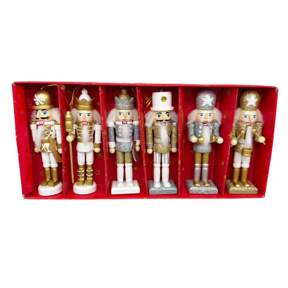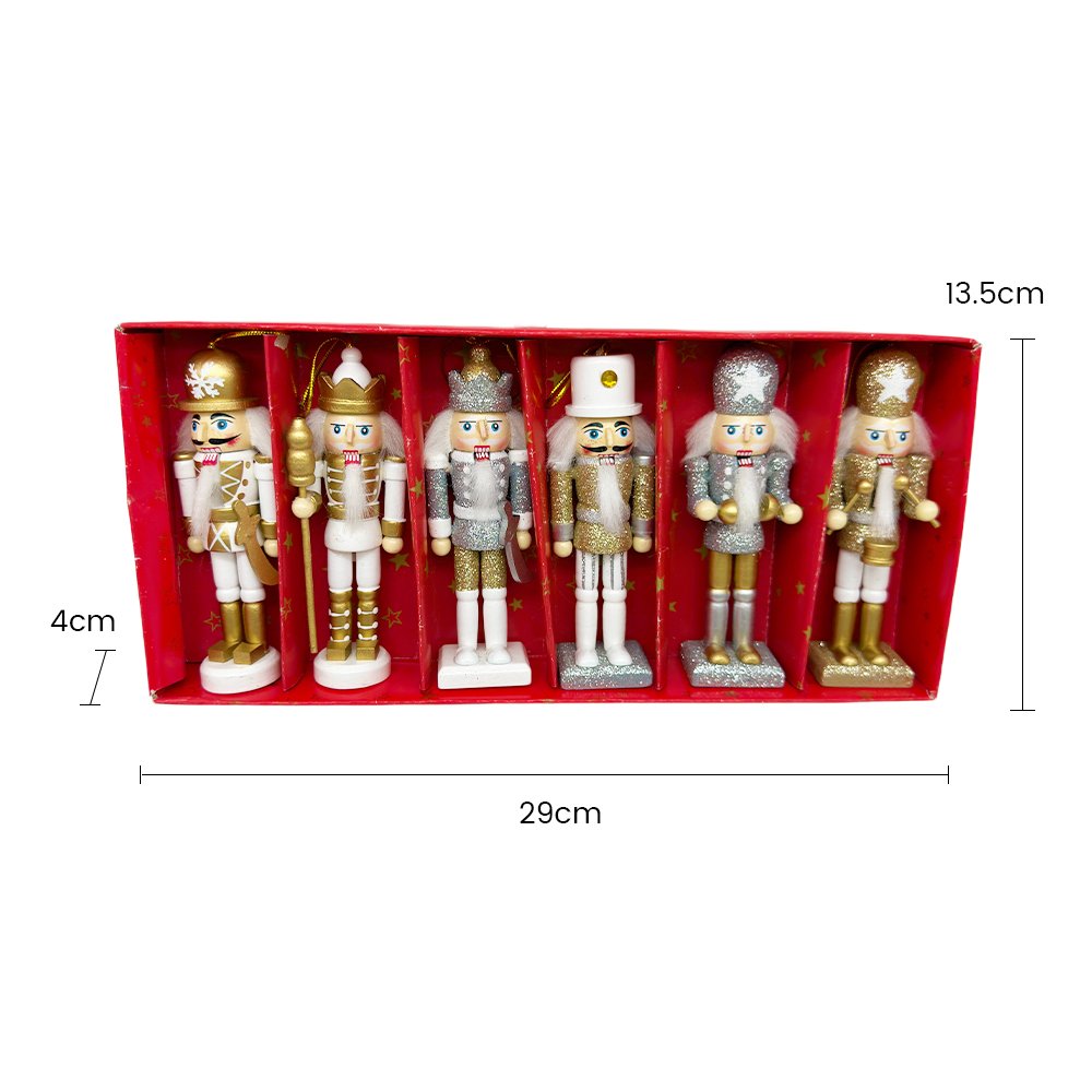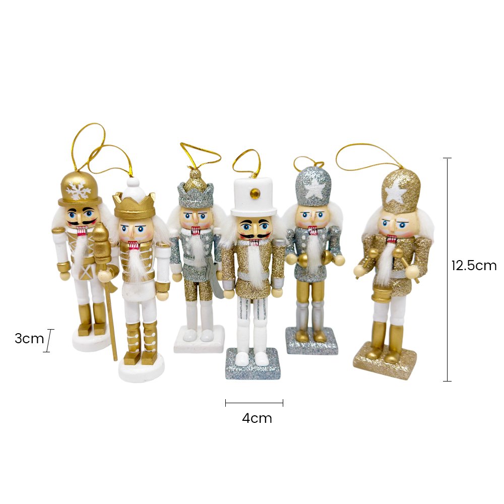 Crafted from durable wood and hand-painted with refined finishes, each nutcracker showcases a unique outfit and pose, creating a cohesive yet varied decorative set. Standing 12.5cm tall, they are perfectly sized for tree branches and decorative hooks without overpowering your décor. Packaged in a gift-ready box, this set is ideal for holiday decorating, seasonal gifting, and collectible Christmas displays.