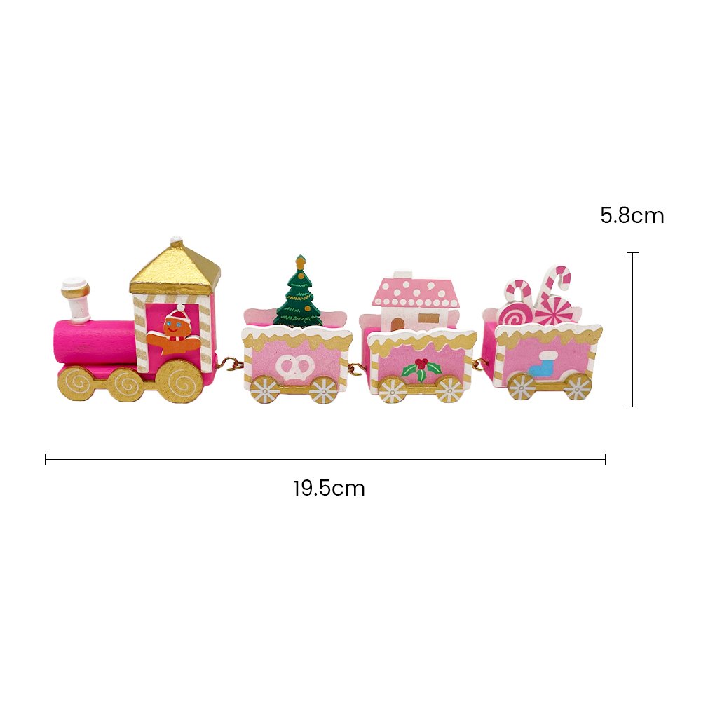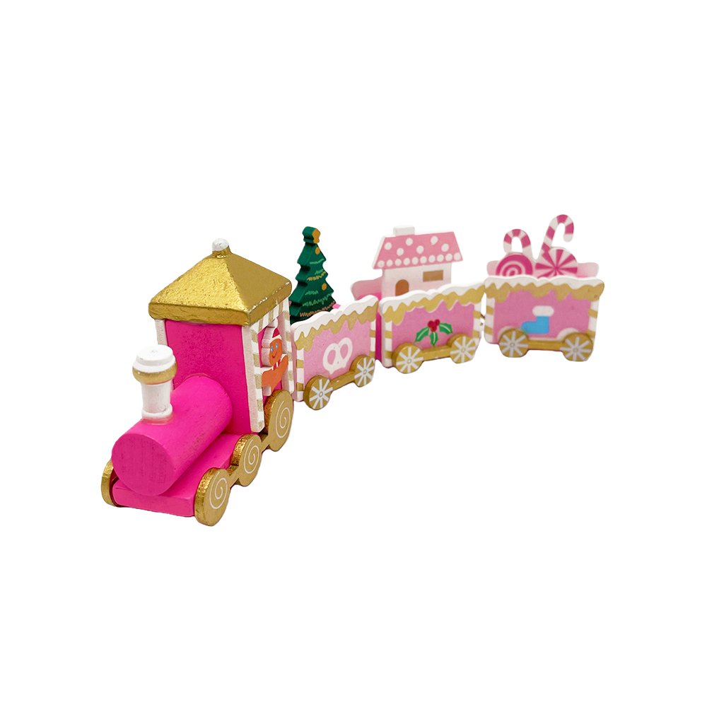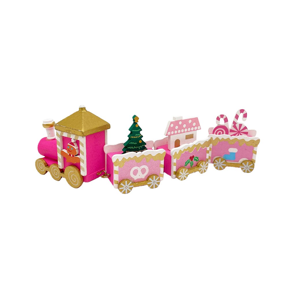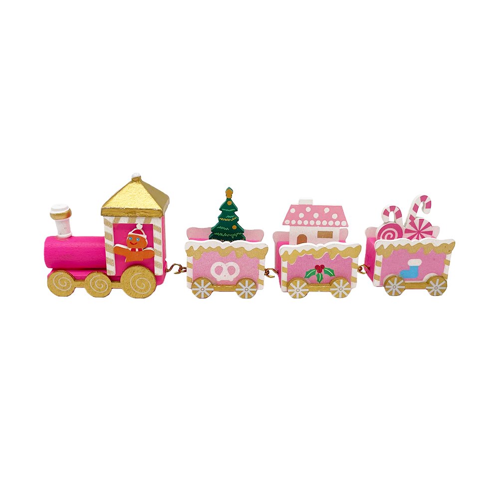 Add a sweet and whimsical touch to your holiday décor with this Pink Gingerbread Christmas Train! Adorably designed in a bright pink color theme with golden accents, this wooden train set includes four linked carts featuring festive elements — a gingerbread figure, decorated Christmas tree, candy canes, and a charming gingerbread-style house.