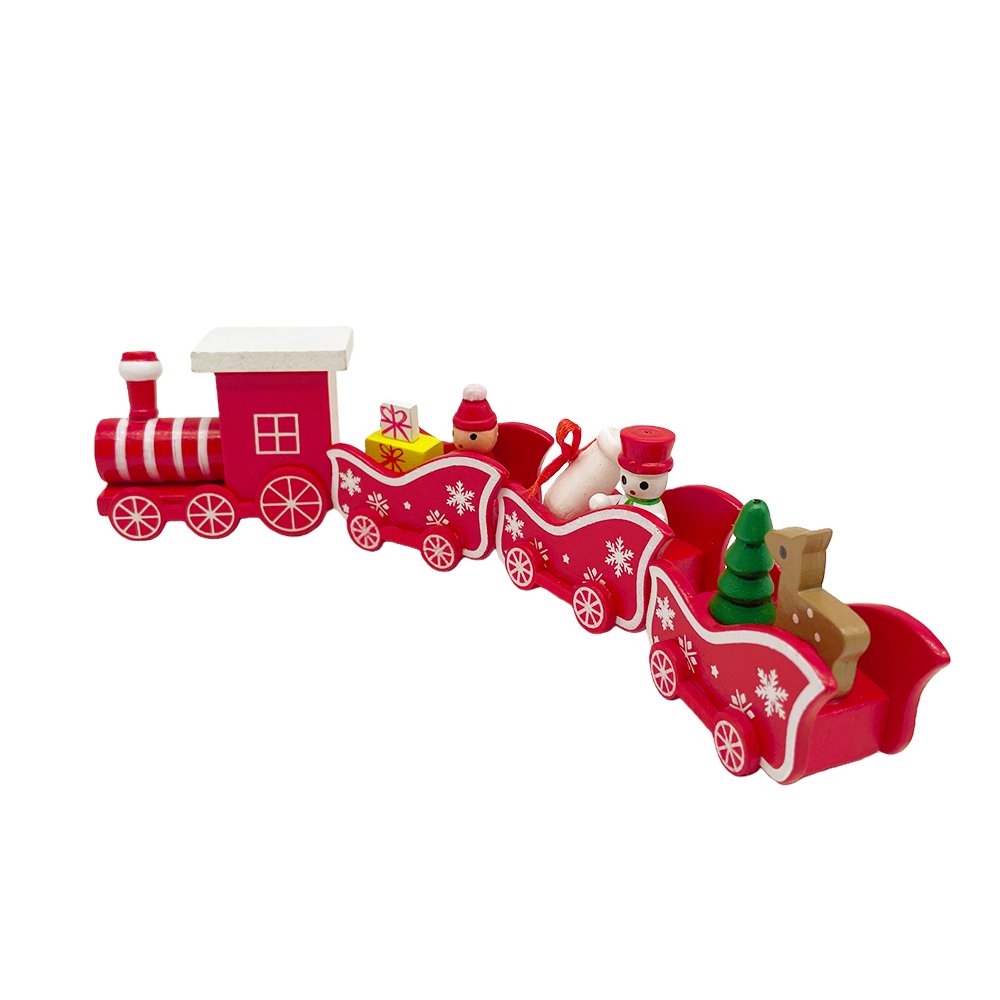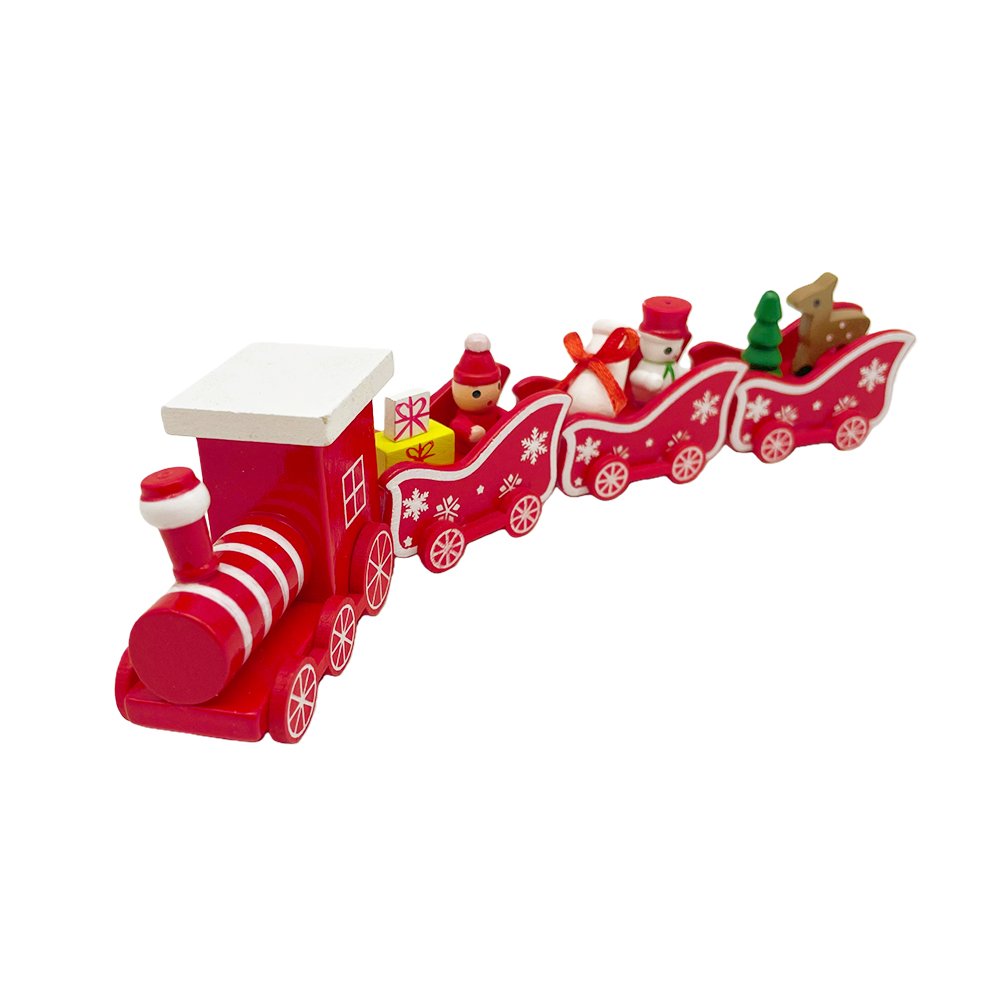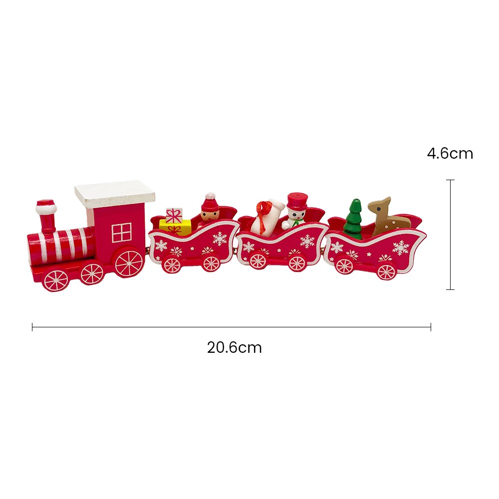 Bring cheerful holiday spirit into your home with this Red Christmas Train with Snowflake Design! This festive wooden train set features four linked carts decorated in classic Christmas red with white snowflake patterns. Each cart is filled with charming mini holiday figures — Santa, a snowman, a Christmas tree, wrapped presents, and an adorable reindeer.