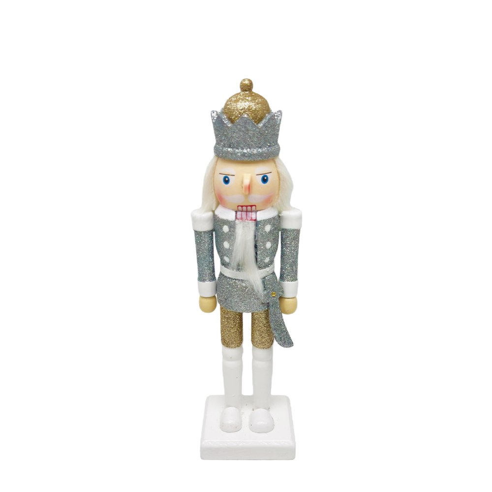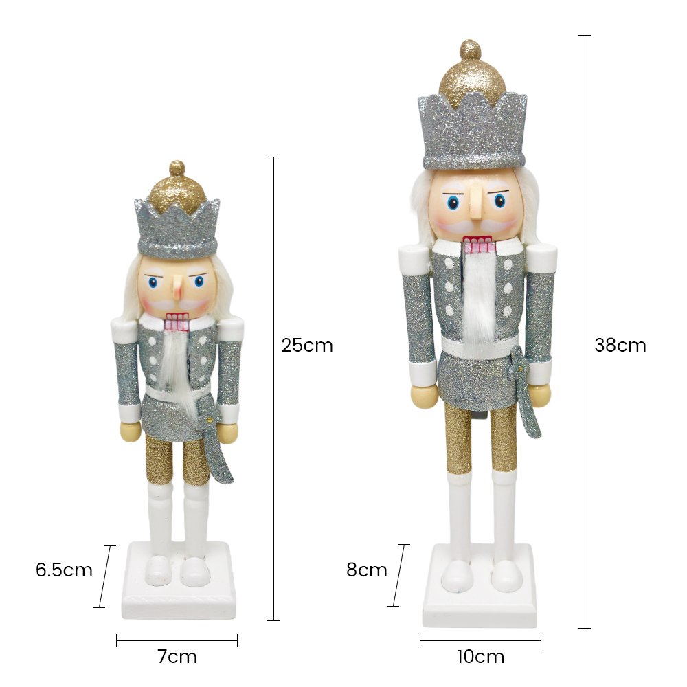 Elevate your Christmas dรฉcor with this Wooden Royal Nutcracker Soldier, designed in a refined silver and gold color palette for a classic yet elegant holiday look. Featuring a glittering silver crown topped with a golden ornament, a tailored uniform with metallic accents, and a flowing white beard, this nutcracker brings timeless festive charm to any seasonal display.