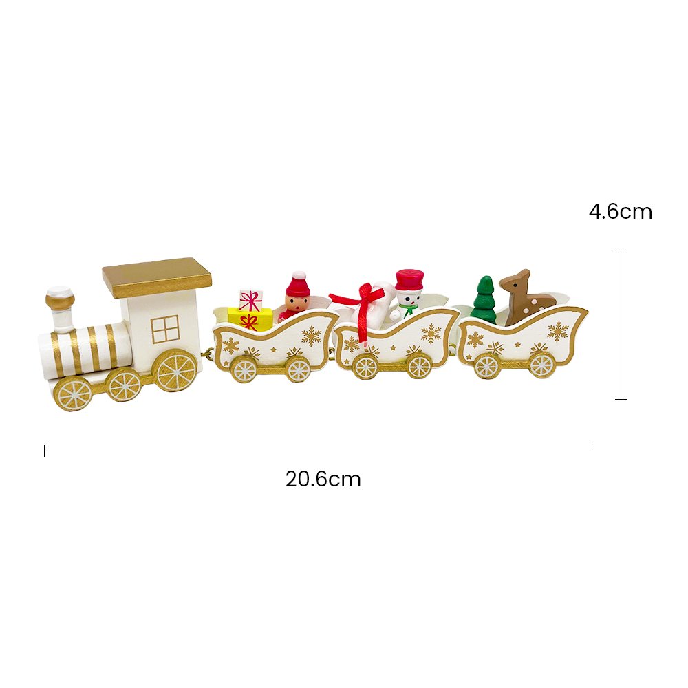 Add a touch of elegance to your seasonal décor with this White & Gold Christmas Train! Designed in a refined winter palette, this wooden train features four connected carts adorned with delicate snowflake accents. Each cart carries charming holiday figures, including Santa, a snowman with a scarf, a Christmas tree, wrapped gifts, and a reindeer — all hand-painted with festive detail.