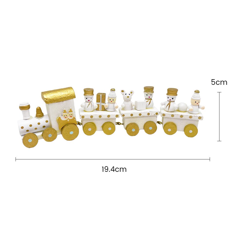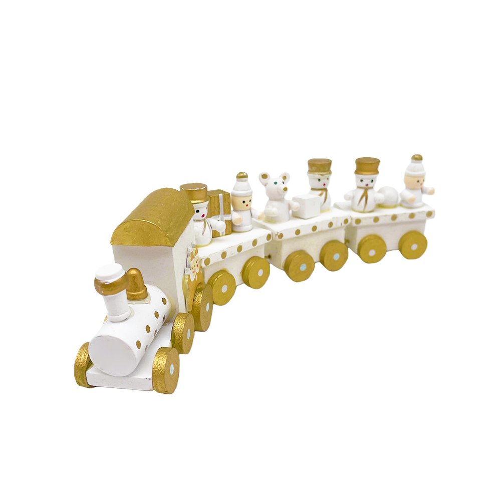 Elevate your Christmas décor with this White & Gold Wooden Christmas Train, designed to bring a touch of elegance to your festive display. This charming handcrafted train includes four detailed carts, each showcasing adorable winter characters such as snowmen, a teddy bear, and beautifully wrapped presents — all in a classy gold-accented palette.