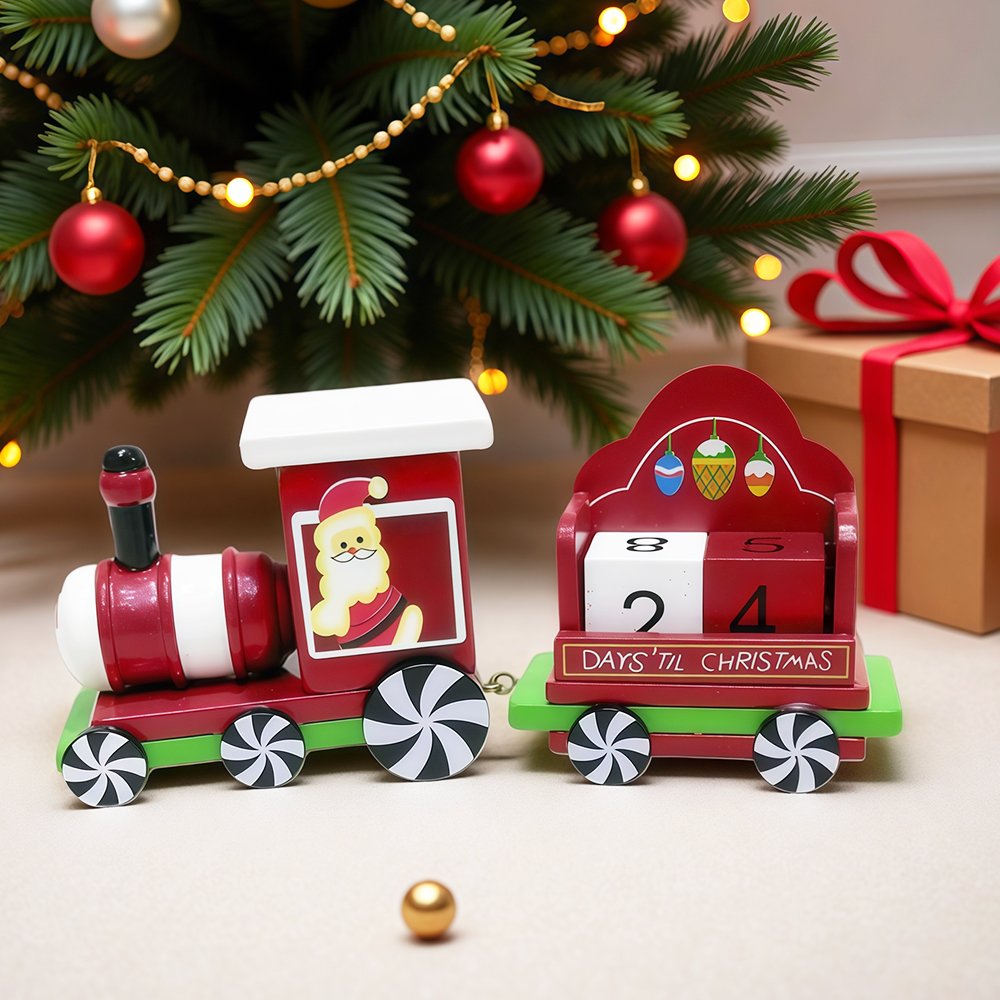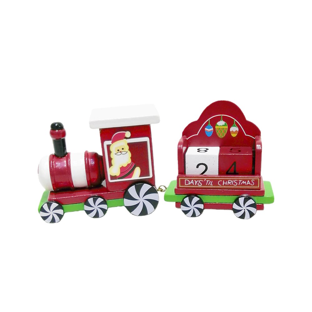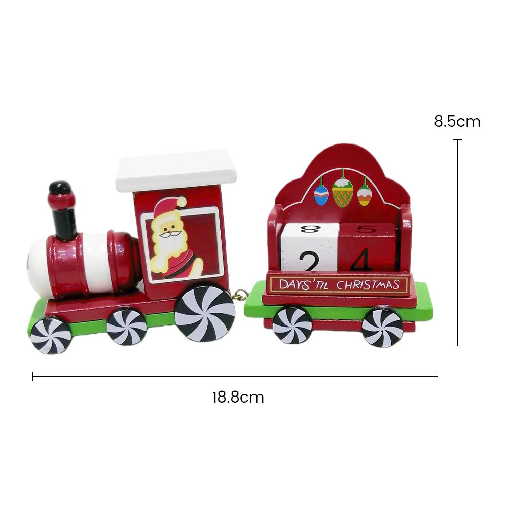 Count down the days until Christmas in festive style with this Wooden Christmas Countdown Train! Designed in classic red, green, and white holiday colors, this charming piece features Santa Claus in the locomotive pulling a cart with removable countdown blocks. The cheerful candy-inspired wheels and hand-painted ornaments add a touch of whimsy, making it a perfect decoration for your mantel, tabletop, or office desk.