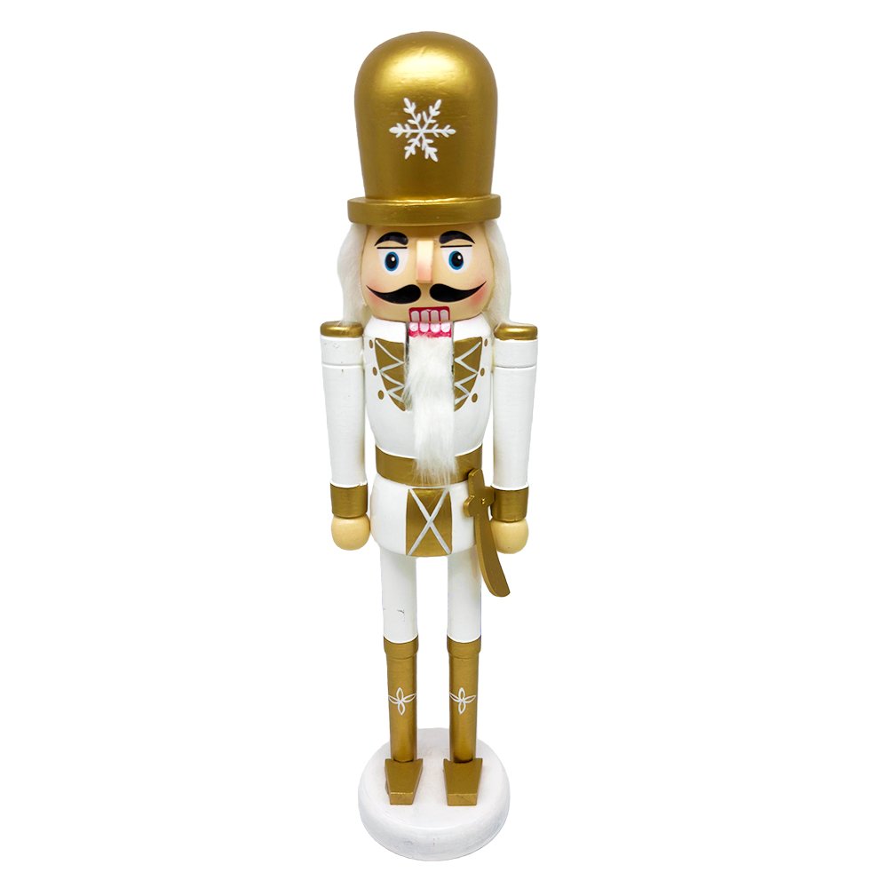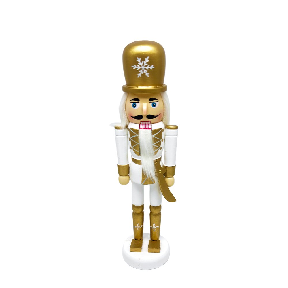Decorate with timeless elegance using this Wooden Classic Nutcracker Soldier featuring a gold snowflake hat and white-and-gold finish. Available in 25cm or 38cm, it’s ideal for Christmas tabletops, mantels, shelves, and refined seasonal displays.
